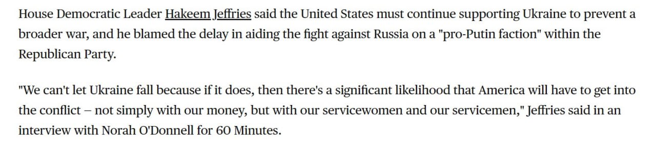 "Мы не можем позволить Украине пасть, потому что если это произойдет, то существует значительная вероятность того, что Америке придется ввязываться в конфликт - не просто с нашими деньгами, но с нашими военнослужащими", - сказал Джеффрис в интервью CBSnews.