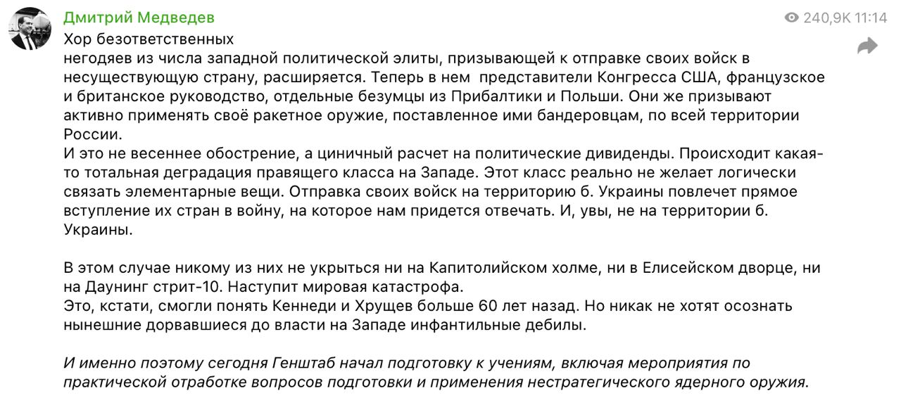 "Отправка своих войск на территорию Украины повлечет прямое вступление их стран в войну, на которое нам придется отвечать. И, увы, не на территории Украины. В этом случае никому из них не укрыться ни на Капитолийском холме, ни в Елисейском дворце, ни на Даунинг стрит-10. Наступит мировая катастрофа", - пишет замглавы совбеза РФ.