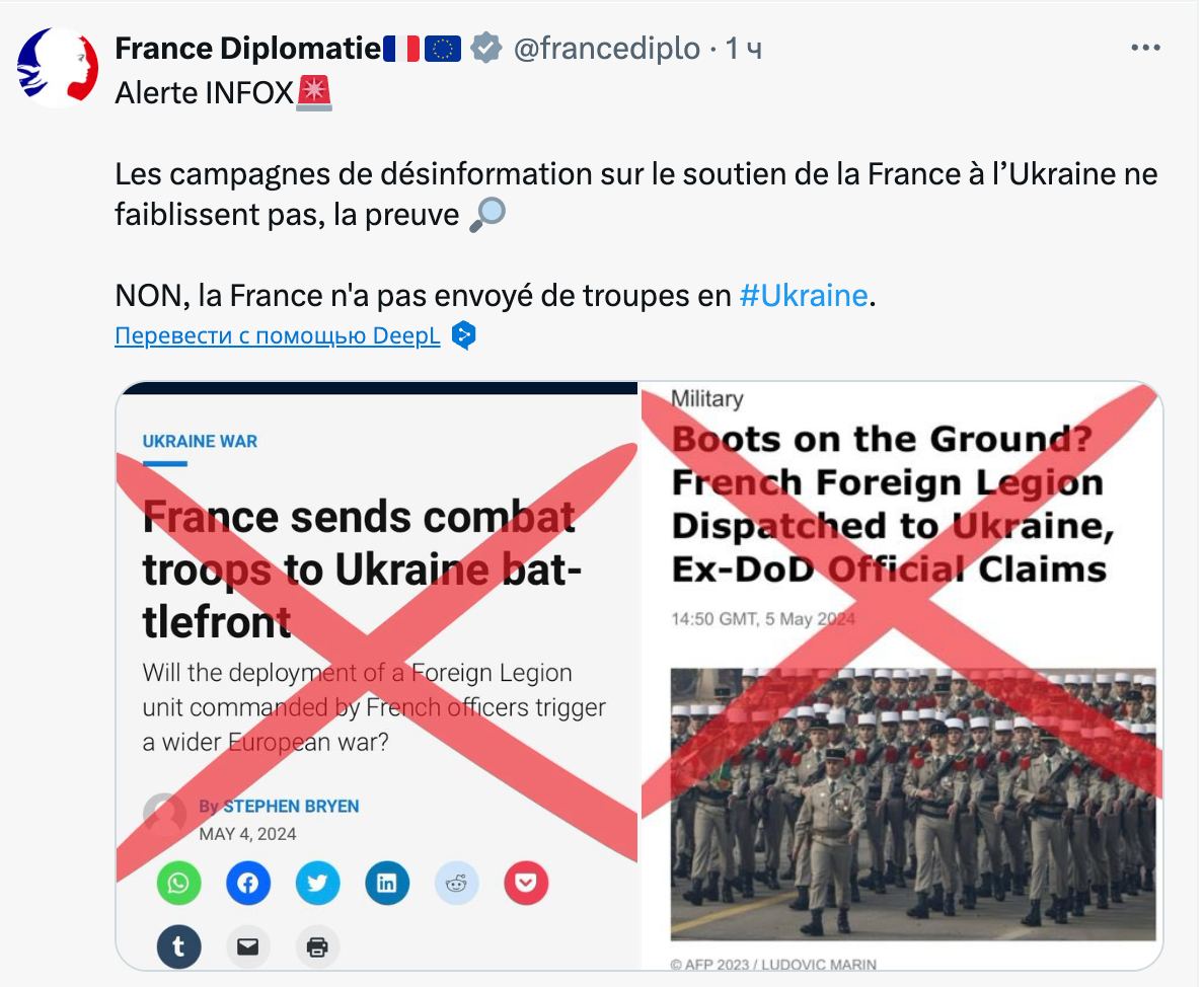 "Кампании по дезинформации, касающиеся поддержки Францией Украины, не прекращаются. Нет, Франция не отправляла войска в Украину", - заявил МИД Франции в Х.