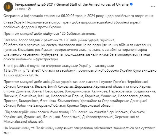 Утром 6 мая Генштаб ВСУ обнародовал сводку о ситуации на фронте за минувшие сутки.