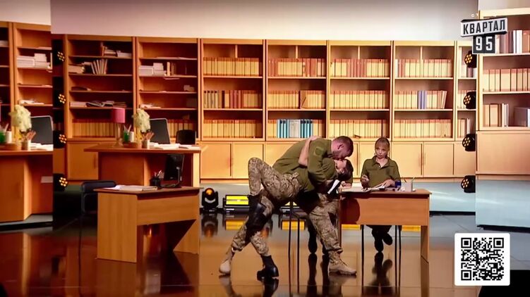 В номере артисты "Квартала" в форме ВСУ рассказывают новой сотруднице, что поцелуи — это своеобразный шифр, с помощью которого они передают информацию начальнику.