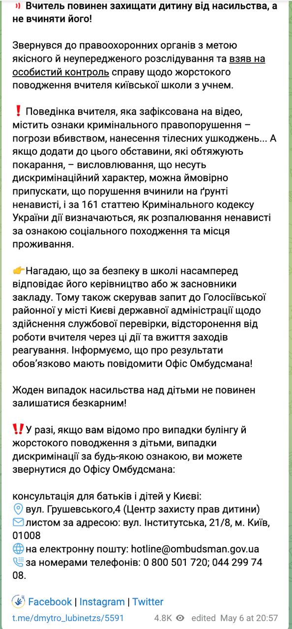 Лубинец сообщил, что видит в поведении учителя признаки угрозы убийством, нанесение телесных повреждений и действия дискриминационного характера на почве ненависти, которые можно трактовать как разжигание ненависти по признаку социального происхождения и места жительства.