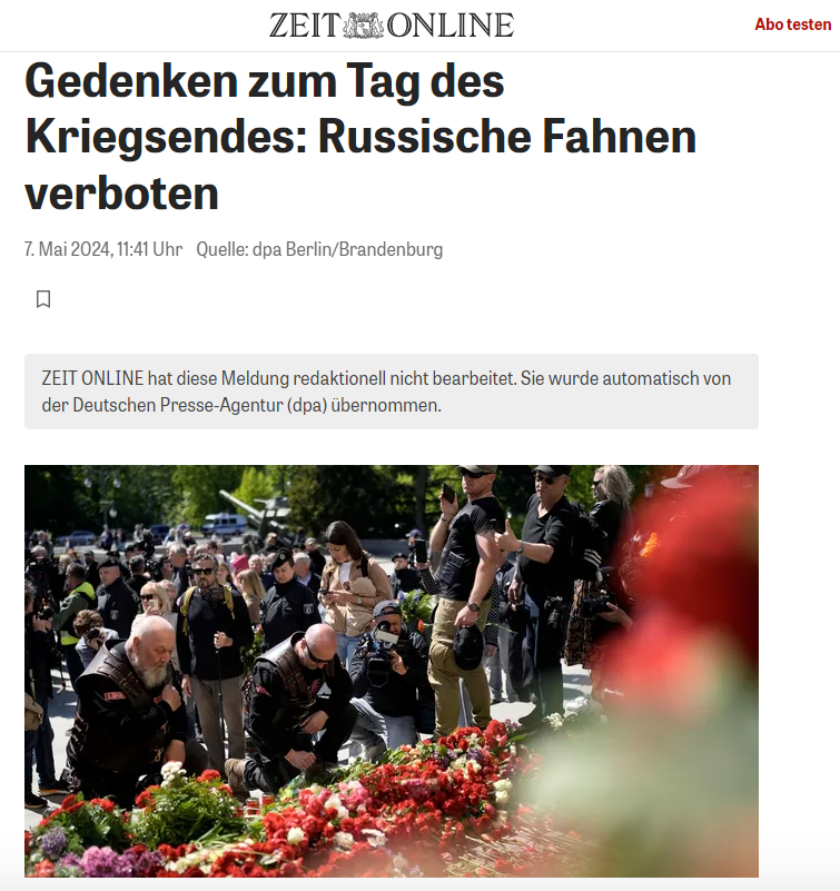 Издание пишет, что в среду и четверг в Берлине запланировано несколько мероприятий по случаю завершения Второй мировой войны в Европе, в частности, состоятся церемонии возложения венков к советским мемориалам в Трептов-парке и Тиргартене, а также митинги у Бранденбургских ворот и в правительственном квартале.