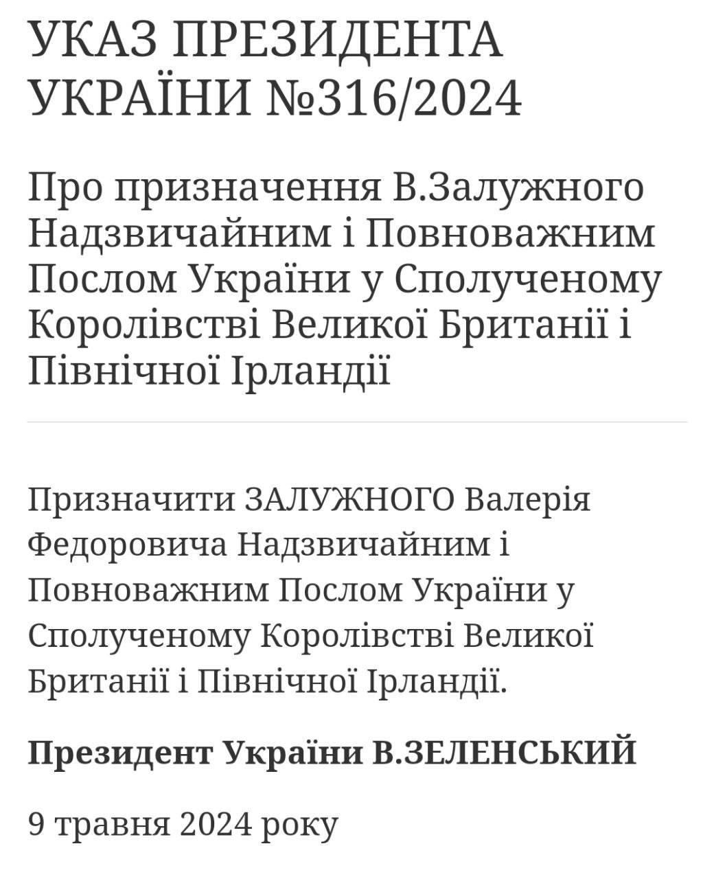 14.08 Экс-главком Залужный официально назначен послом Украины в Британии.