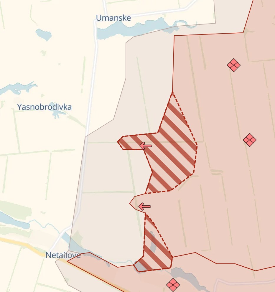 На карте Deep State село находится под контролем ВСУ, только на юге небольшая его часть в серой зоне. При этом, по данным паблика, россияне за вчера продвинулись южнее - в сторону Яснобродовки и Нетайлово.