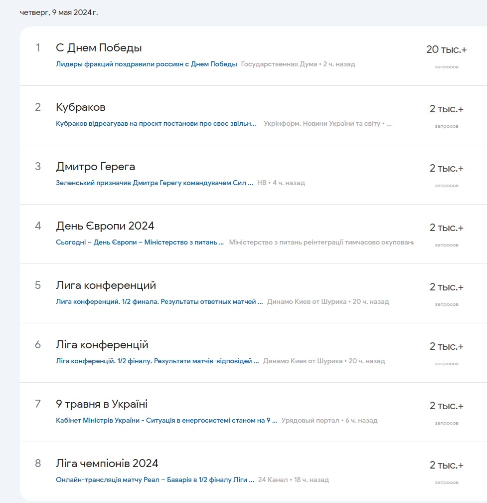 В этом году жители Украины, несмотря на "отмену" праздника, активно искали информацию о Дне Победы в Google. Этот запрос - "День Победы" - стал самым популярным из Украины за весь день, по данным сервиса Google Trends.