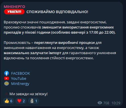 Также "Укрэнерго" ввела ограничение потребления электричества для промышленных потребителей. В энергосистеме образовался дефицит электроэнергии, который не способен полностью покрыть даже импорт электроэнергии из Европы.