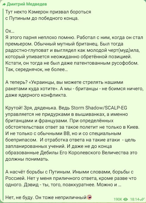 18.37 Зампред Совбеза РФ Дмитрий Медведев назвал целью запланированных учений по использованию тактического ядерного оружия отработку ответа на возможную атаку на РФ британским оружием, о вероятности которой заявлял глава МИД Британии Кэмерон.