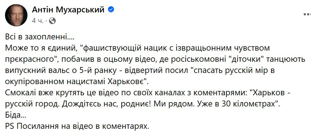 "Может, я единственный "фашиствующий нацик с извращенным чувством прекрасного", кто увидел в этом видео, где русскоязычные "детки" танцуют выпускной вальс в 5 утра – откровенный посыл "спасать русский мир в оккупированном нацистами Харькове", – написал Мухарский.