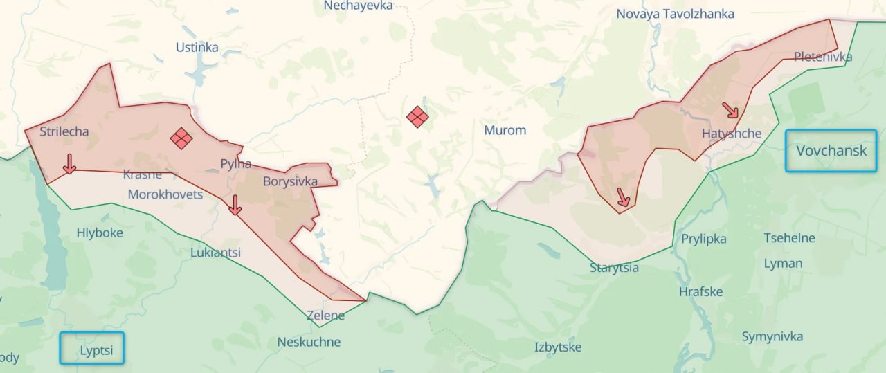 Телеграм-канал указывает два направления российского наступления. Первое - на Липцы. В этом районе войска РФ закрепляются в селах Мороховец, Олейниково, Лукьянцы и Зеленое.