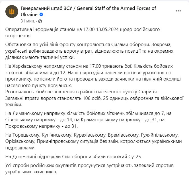 "Наши подразделения... проводят мероприятия по зачистке на северной окраине населенного пункта Волчанск", - заявляет Генштаб.