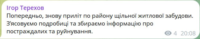 20:13 В Харькове, предварительно, снова прилет по району плотной жилой застройки.