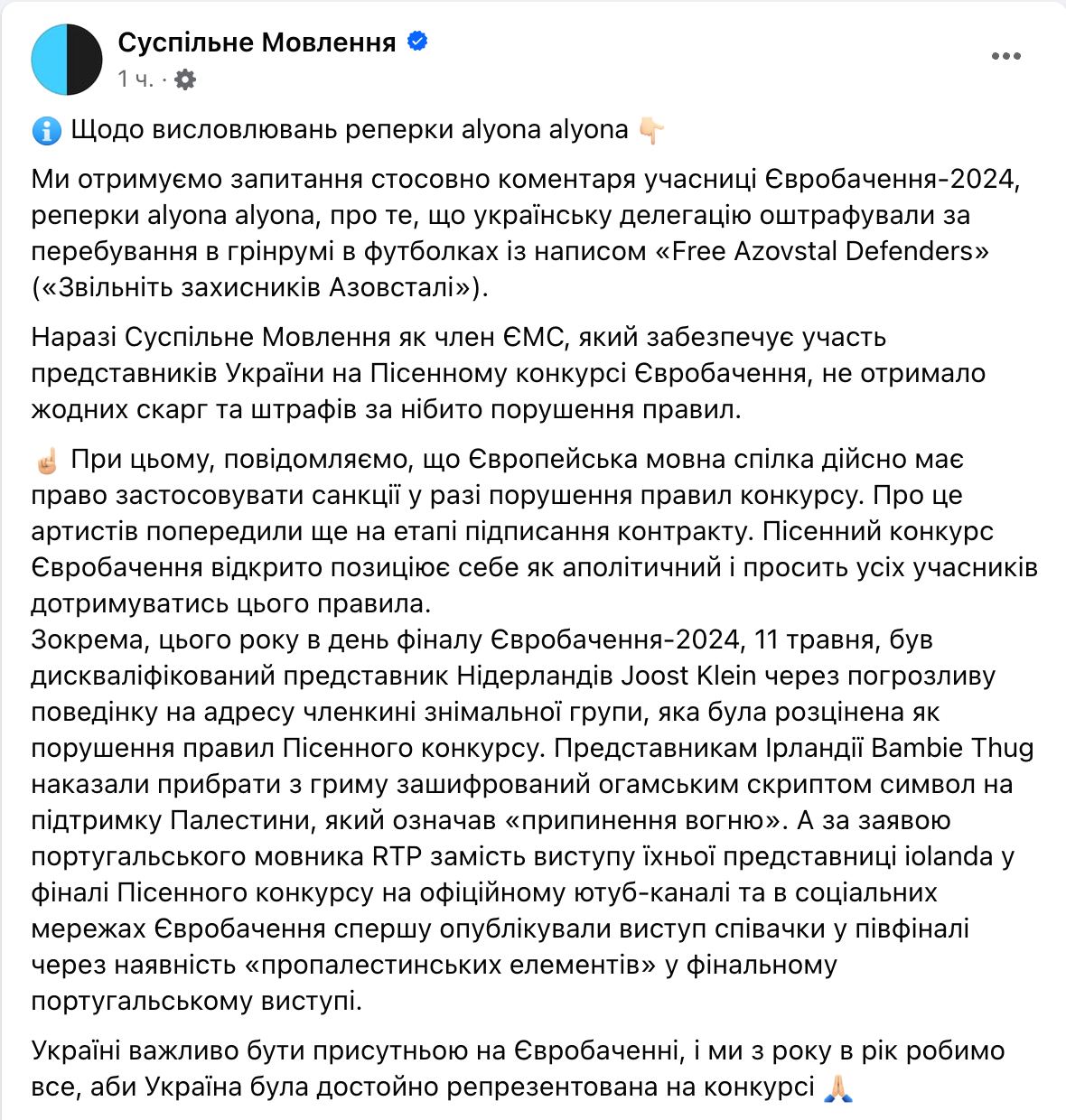 Позже "Суспильне" заявило, что не получало штрафов и жалоб от Евровидения за футболки украинской делегации с упоминанием пленных бойцов "Азова".