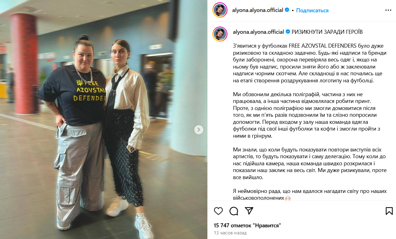 "Мы знали, что когда будут показывать повторы выступлений всех артистов, то будут показывать и саму делегацию. Поэтому, когда к нам подошла камера, наша команда быстро раскрылась и показала наш призыв на весь мир. Мы очень рисковали, но все получилось. Отбились просто финансовым штрафом", — написала alyona alyona.