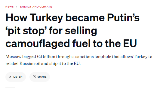 Турция продает российскую нефть, маскируя ее под собственную и экспортируя в ЕС, таким образом принося миллиардную прибыль России.