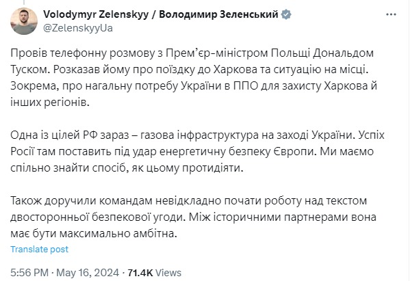 Об этом заявил президент Владимир Зеленский во время разговора с премьер-министром Польши Дональдом Туском, о чем он сообщил в своих соцсетях.