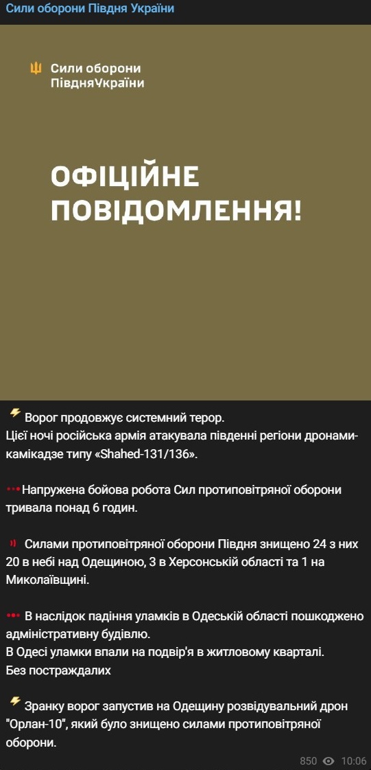 11:22 Сегодня ночью российская армия атаковала южные регионы дронами-камикадзе типа "Shahed-131/136". В Одесской области сбили 20 "Шахедов", 3 в Херсонской и 1 в Николаевской. Боевая работа продлилась более 6 часов.