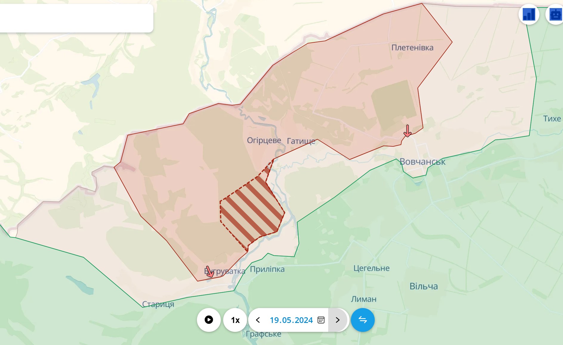 К западу от Волчанска россияне заняли новые территории на правом берегу Северского Донца, севернее недавно захваченной Бугроватки. Россияне говорят, что РФ атакует село Прилипка к западу от Волчанска, пытаясь прорваться на левый берег Донца и приблизиться к частичному окружению Волчанска.