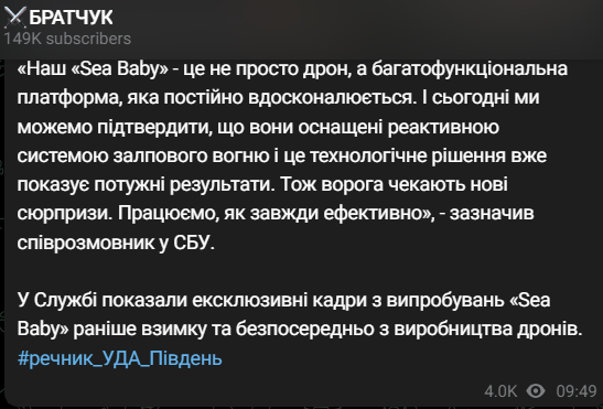 "Наш "Sea Baby" – это не просто дрон, а постоянно совершенствующаяся многофункциональная платформа. И сегодня мы можем подтвердить, что они оснащены реактивной системой залпового огня, и это технологическое решение уже показывает мощные результаты. Так что врага ждут новые сюрпризы. Работаем, как всегда эффективно", - отметил собеседник в СБУ.