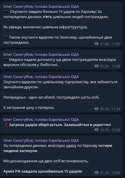 Об этом сообщают в своих телеграм-каналах глава Харьковской ОВА Олег Синегубов и мэр Харькова Игорь Терехов.