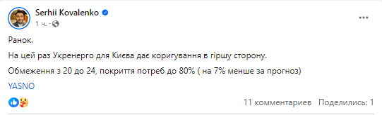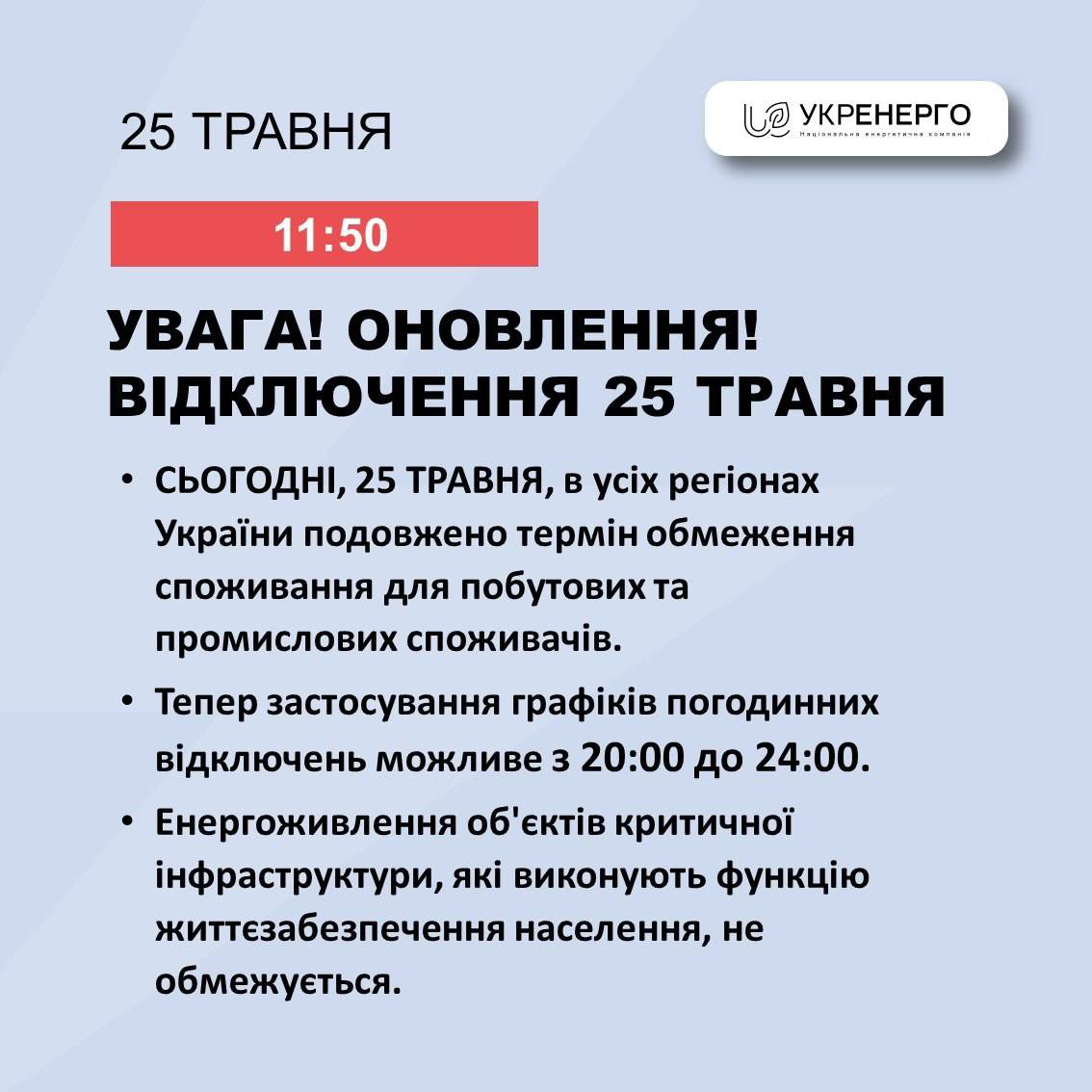 "Графики почасовых отключений будут задействованы с 20:00 до 24:00. Энергопитание объектов критической инфраструктуры, выполняющих функцию жизнеобеспечения населения, не ограничивается" - говорится в заявлении.