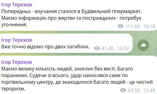 Об этом сообщают мэр города Игорь Терехов и глава Харьковской областной военной администрации Олег Синегубов в своих телеграм-каналах.