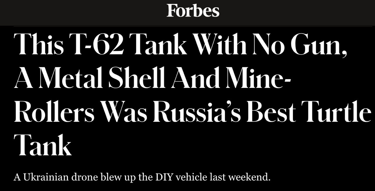 09.20 Forbes рассказывает о российских "танках-черепахах" - обшитых со всех сторон металлом танках Т-62 без пушки.