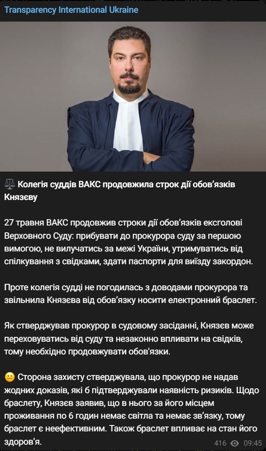 Сегодня, 27 мая, Высший антикоррупционный суд продлил срок действия обязанностей, наложенных на экс-главу Верховного Суда Всеволода Князева, подозреваемого в получении 2,7 млн долларов взятки. Но с него сняли электронный браслет.