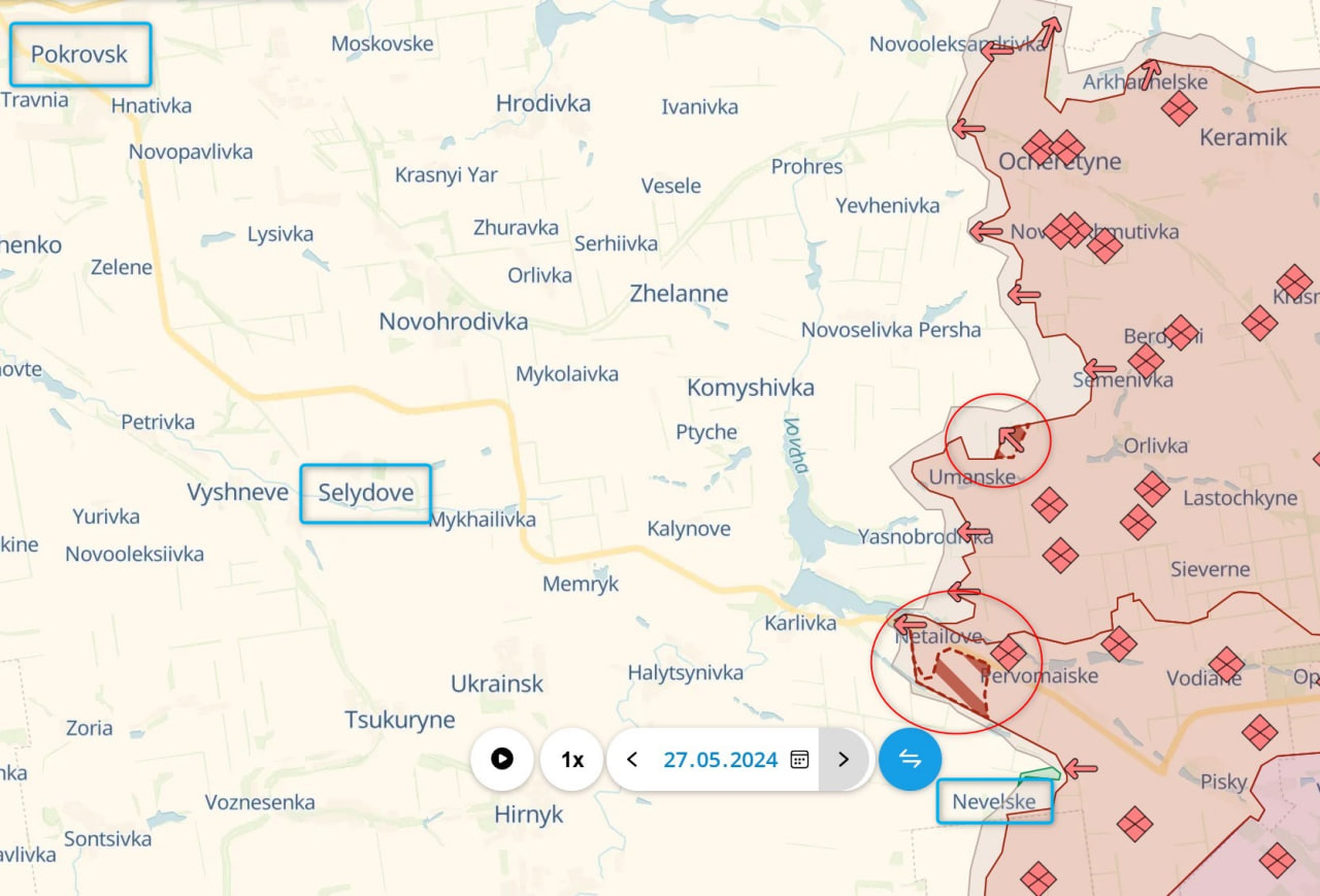 За минувшие сутки российские войска снова продвинулись на Покровском направлении - в районе Уманского и к югу от Нетайлово. Об этом свидетельствует карта Deep State.