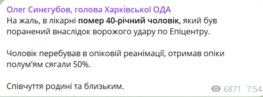 "В больнице скончался 40-летний мужчина, который был ранен в результате вражеского удара по "Эпицентру". Мужчина получил ожоги до 50% и находился в ожоговой реанимации", - говорится в сообщении.