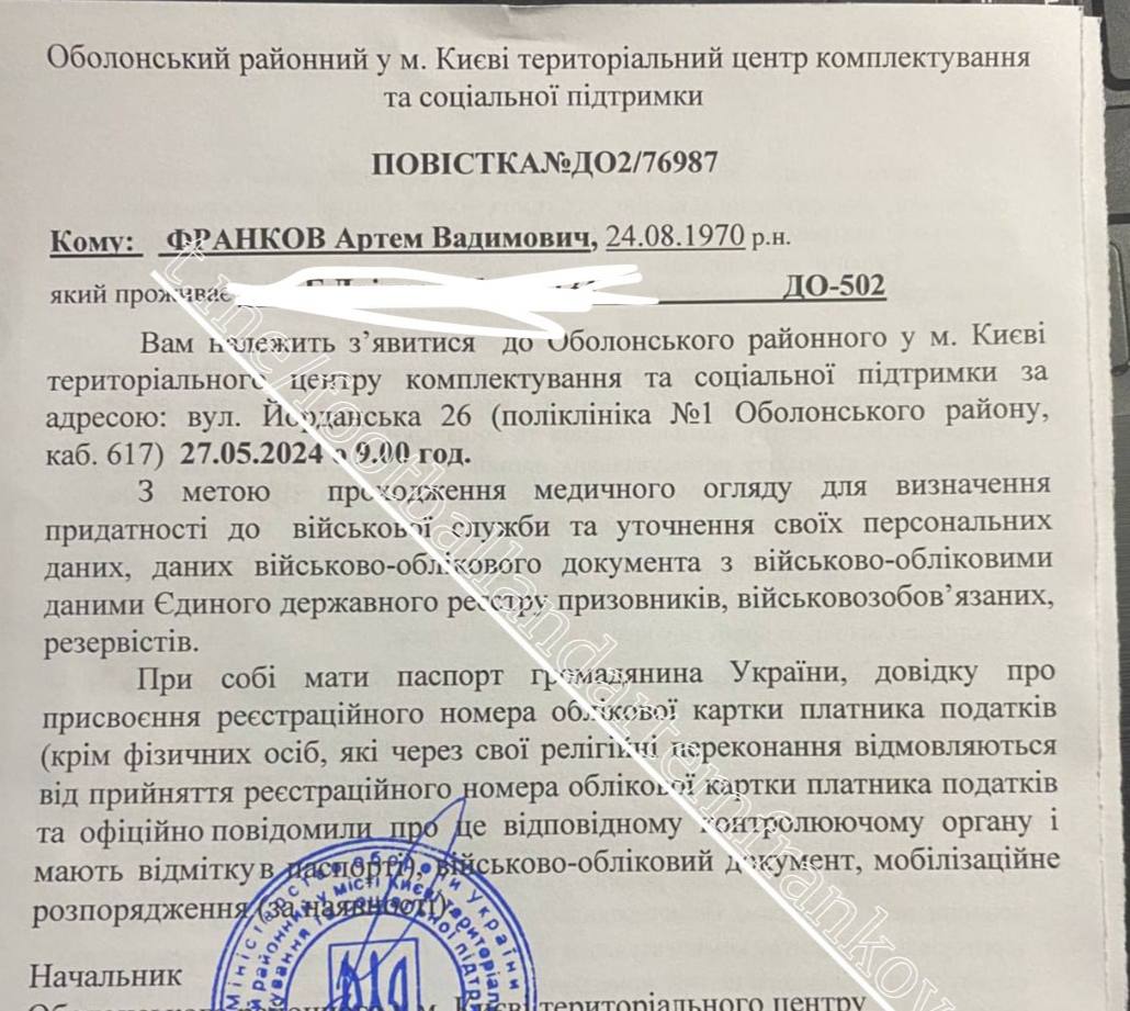 Напомним, ранее Оболонский ТЦК дал официальное разъяснение по поводу повестки, присланной Артему Франкову, который умер в октябре прошлого года.