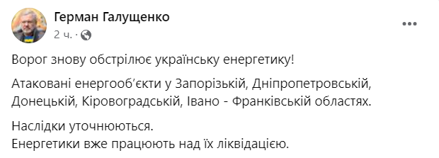 08:00 Сегодня ночью россияне обстреляли украинскую энергетику. Атакованы энергообъекты в Запорожской, Днепропетровской, Донецкой, Кировоградской, Ивано-Франковской областях.