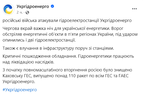 13:10 Сегодня ночью ракетной атаке подверглись две гидроэлектростанции, заявили в "Укргидроэнерго".