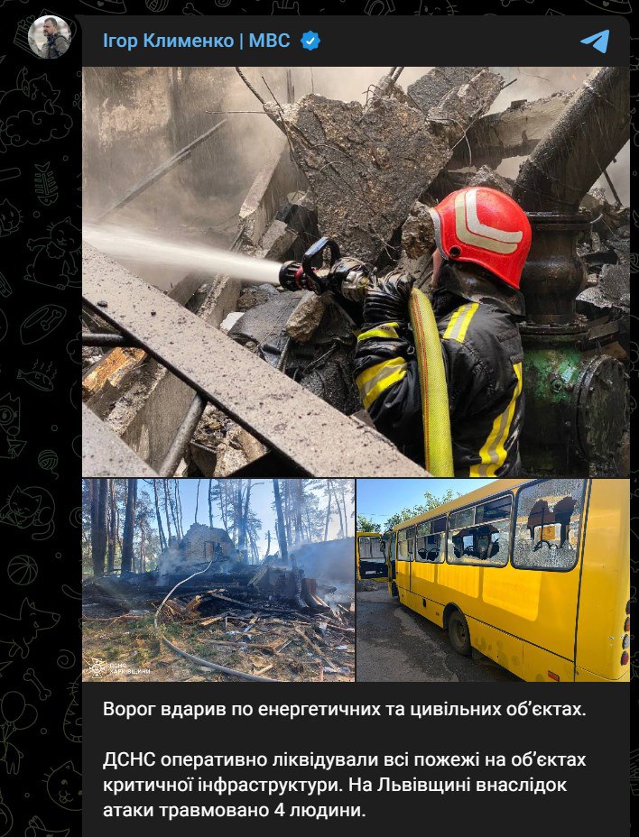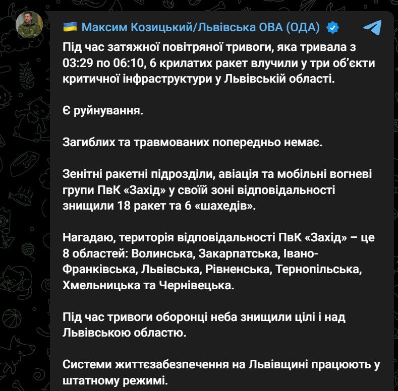 09:55 Во Львовской области шесть крылатых ракет попали в три объекта критической инфраструктуры.