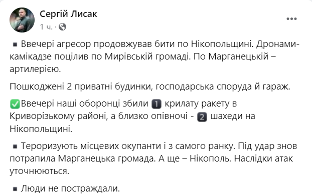 ВСУ сбили крылатую ракету в Криворожском районе, а около полуночи два "Шахеда" на Никопольщине.