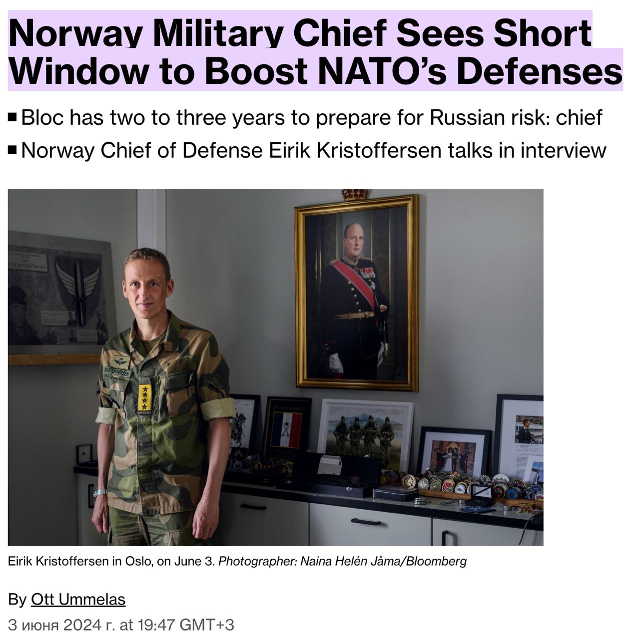 09:25 У НАТО есть два-три года, чтобы подготовиться к возможному российскому нападению, заявил Bloomberg глава Вооруженных сил Норвегии генерал Эйрик Кристофферсен.