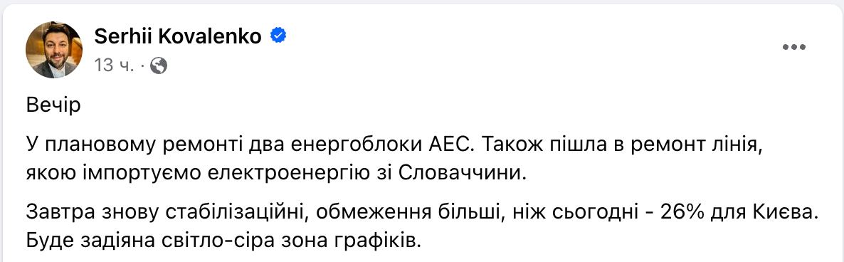 14:47 В Киеве введены аварийные отключения света, сообщает гендиректор Yasno Сергей Коваленко.