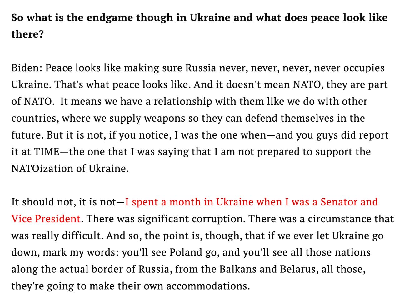 "Украина никогда не должна быть оккупированной Россией. И это не означает, что она (Украина - Ред.) становится частью НАТО. Это означает, что у нас с ними такие же отношения, как и с другими странами, когда мы поставляем им оружие, чтобы они могли защитить себя в будущем. Но я был тем, кто говорил, что не готов поддержать НАТОизацию Украины", - заявил он в интервью Time.