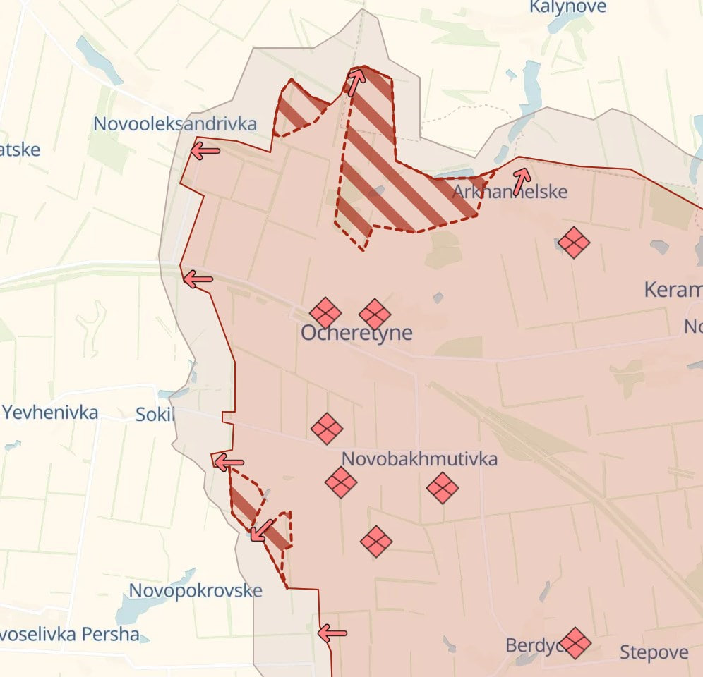 Вчера вечером украинский военный паблик Deep State сообщил, что РФ продвинулась сразу на трех участках под Авдеевкой - к северу от Очеретино (Архангельское и Новоалександровка) и в районе Новопокровского.