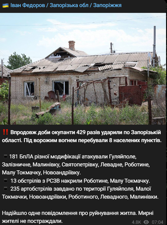 08:13 В течение минувших суток российские войска 429 раз ударили по Запорожской области. Под вражеским огнем находились 8 населённых пунктов. Погибших и раненых нет.