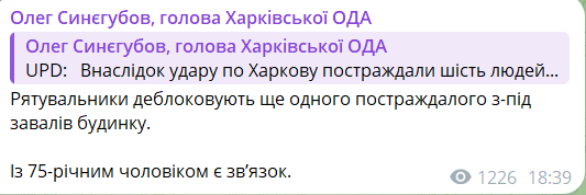 В свою очередь глава Харьковской ОВА Олег Синегубов сообщил, что в результате удара по Харькову пострадали шесть человек, повреждены жилые дома, гаражи и авто.