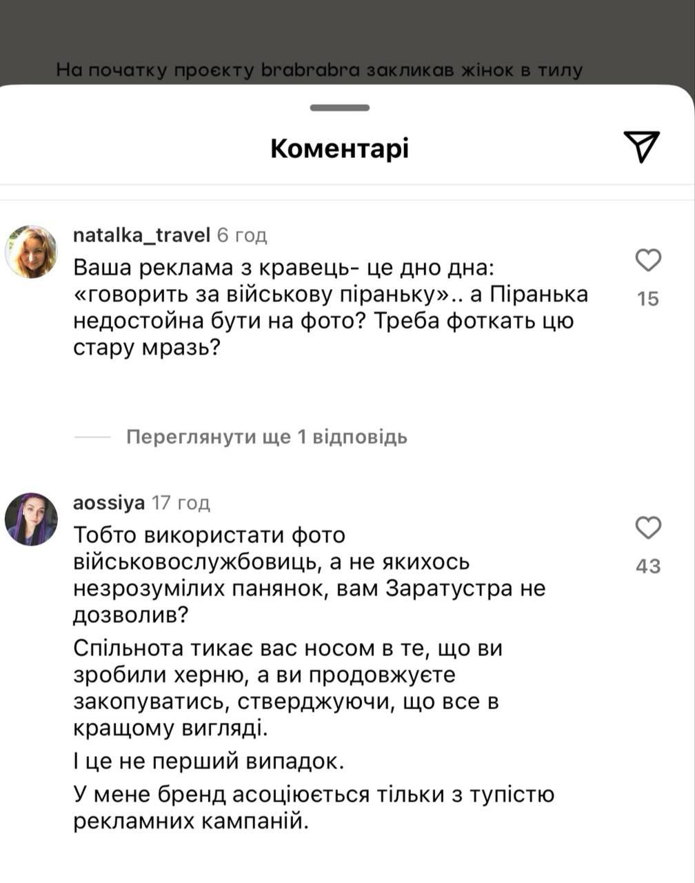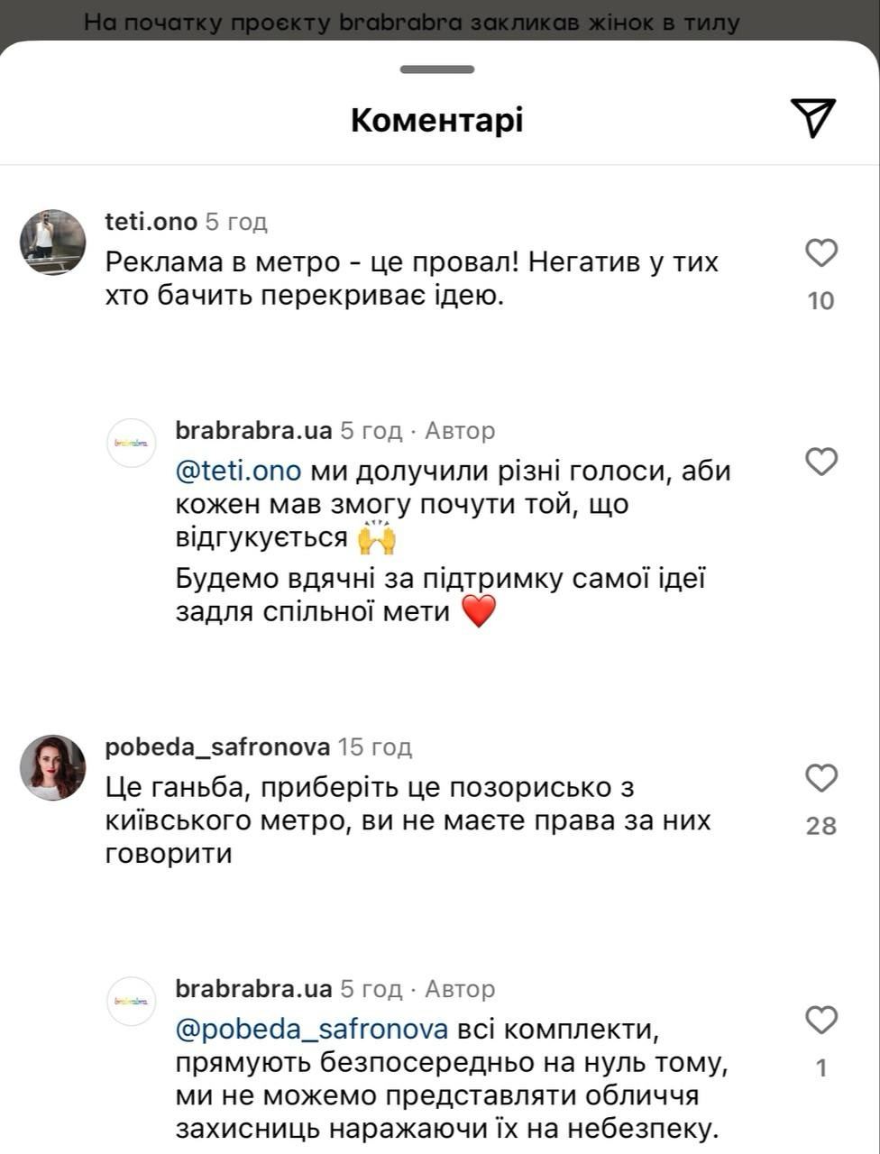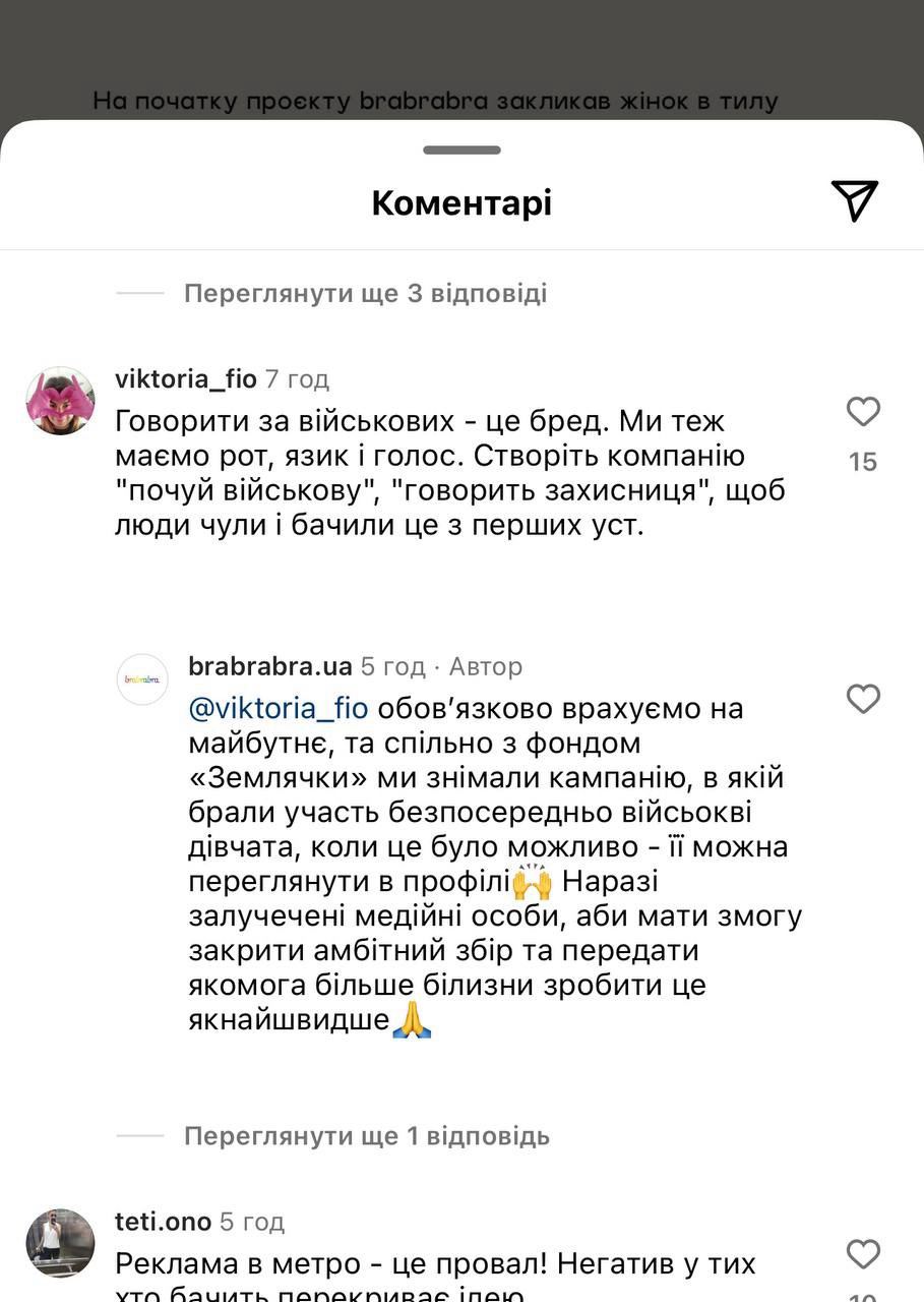 Инициатива "Одна за одну", в рамках которой была запущена реклама, призвана обеспечить "качественными комплектами защитниц и актуализировать важность темы комфортного белья для женщин на передовой". Однако пользователи социальных сетей начали обвинять бренд brabrabra и Кравец в неадекватном креативе и пиаре на теме военных.