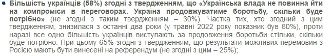 58% опрошенных заявили, что украинская власть не должна идти на компромиссы в переговорах с РФ и должна продолжать борьбу столько, сколько возможно. В мае 2022 года таковых было 80%.