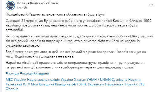Полиция Киевской области подтвердила, что в Буче мужчина взорвал гранату в авто, требуя от водителя везти его на границу с Беларусью.