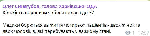 В свою очередь глава Харьковской ОВА Олег Синегубов сообщил, что число раненых в Харькове увеличилось до 37 человек. Четыре человека в тяжелом состоянии, врачи борются за их жизни.