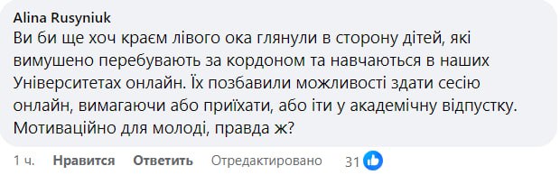 Alina Rusyniuk: "Вы бы еще хоть краем левого глаза взглянули в сторону детей, вынужденно находящихся за границей и обучающихся в наших университетах онлайн. Их лишили возможности сдать сессию онлайн, требуя либо приехать, либо уходить в академический отпуск. Мотивационно для молодежи, правда?"