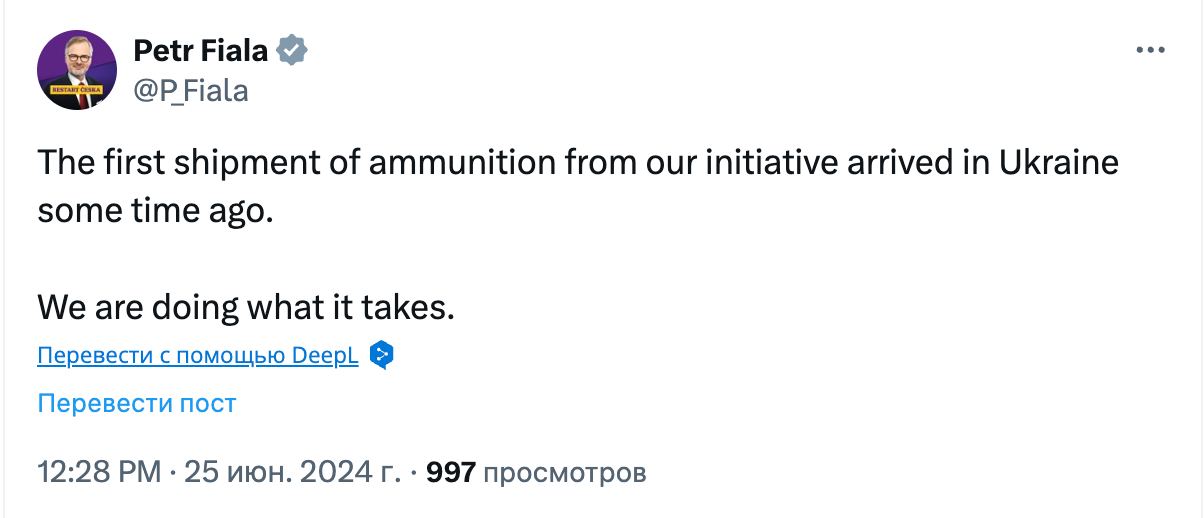 Первая партия боеприпасов, закупленных в рамках чешской инициативы, уже прибыла в Украину "некоторое время назад".