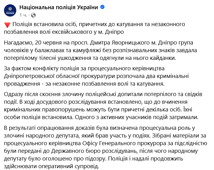 Полиция задержала одного из причастных к избиению экс-военного в ходе конфликта с нардепом Тищенко в Днепре
