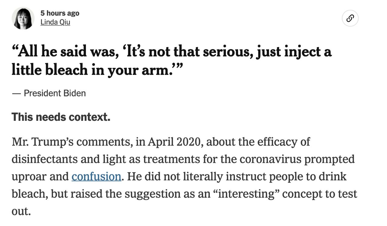 Байден заявил, что Трамп предлагал людям колоть отбеливатель вместо вакцины от COVID-19. NYT это опровергает