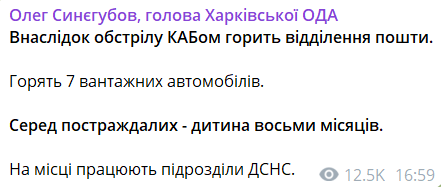 В свою очередь Синегубов сообщил, что в результате удара авиабомбы загорелись почтовое отделение и семь грузовых машин.